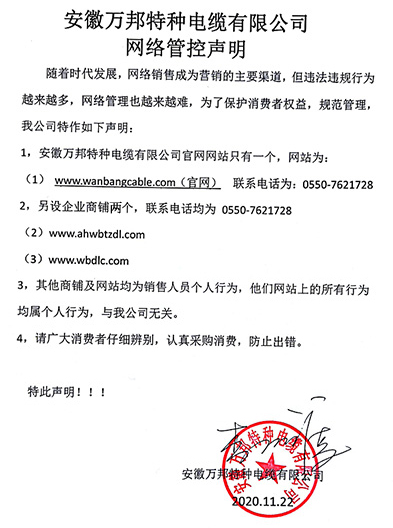 鄭重聲明:安徽萬邦特種電纜有限公司官方網站為:www_wanbangcable_com.sxgtf.cn,除此之外無任何子網站或合作網站,其余均為假冒偽劣。電話:0550-7621728 13485756353 地 址:安徽省天長市滁州高新技術產業開發區經四路29號